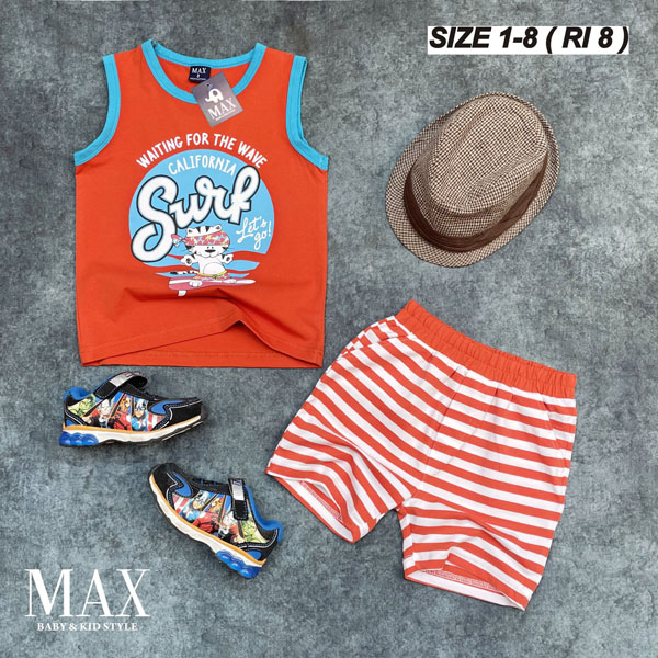 A208330 - Bộ Max BT thun cotton 4c, quần sọc dệt, áo viền phối màu, in mèo lướt ván Surf_Size 1-8