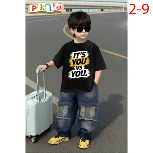 A478063 - Set jean sang trọng lịch lãm cho các bé trai áo thun cotton 4c in chữ quần jean dài_Size 2