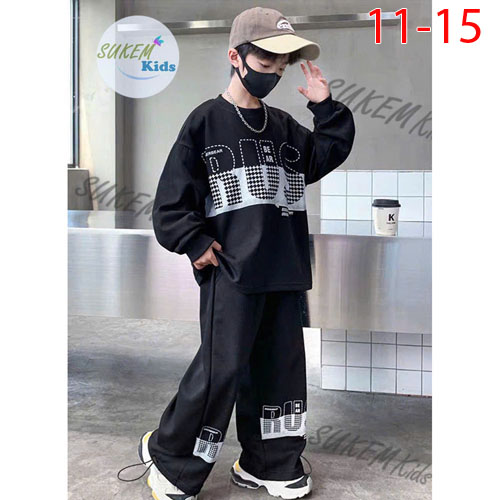 A480201 - Bộ thun da cá dài tay bé trai áo may cắt phối với bo dệt in RUS quần dài suống rút dây 2 b