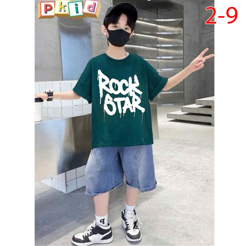 A480262 - Set jean sang trọng lịch lãm cho các bé trai áo chất thun in chữ quần jean lửng_Size 2-9
