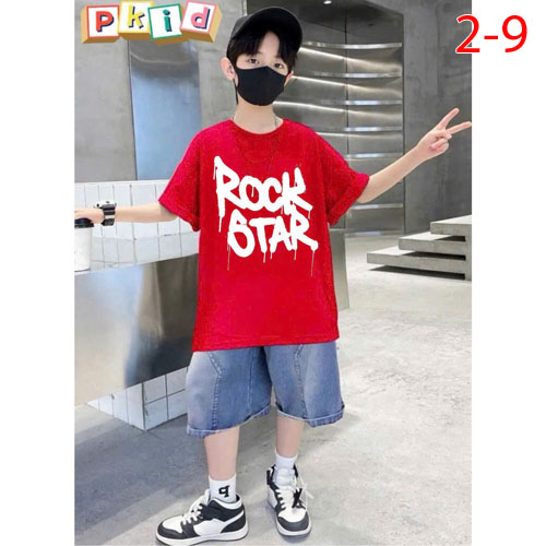 A480267 - Set jean sang trọng lịch lãm cho các bé trai áo chất thun in chữ quần jean lửng_Size 2-9