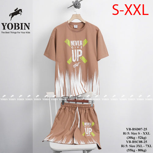 A480533 - Bộ short bé trai form rộng in NEVER GIVE UP quần short 2 túi thật lưng thun có dây rút_Siz