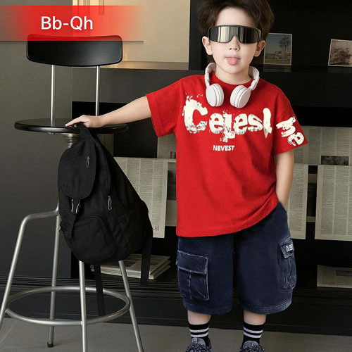 A480585 - Bộ phối màu đơn giản cho bé trai áo thun cotton 4c in chữ Celeslhe quần vải jean mềm mại t