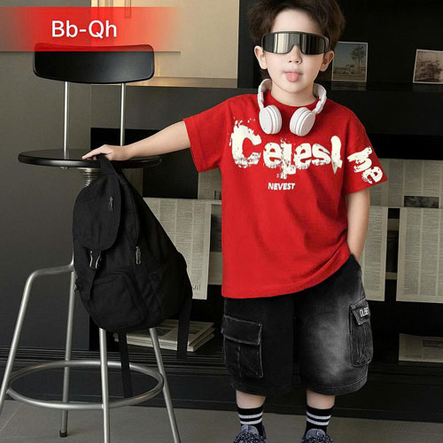 A480590 - Bộ phối màu đơn giản cho bé trai áo thun cotton 4c in chữ Celeslhe quần vải jean mềm mại t
