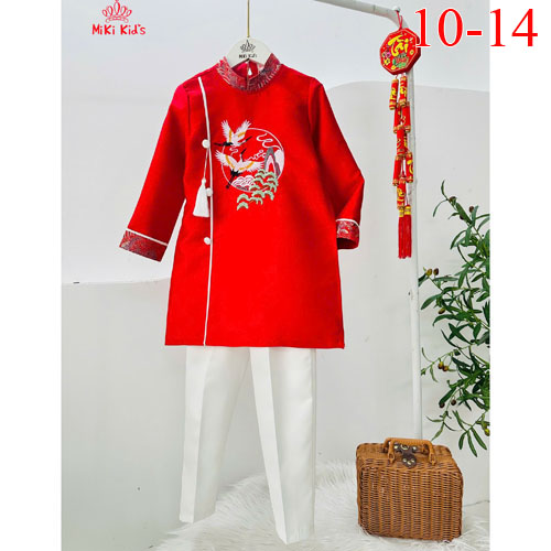 A480945 - Set Áo dài bé trai thêu chim hạc chất liệu áo tơ gỗ ánh kim kèm quần chất phi mềm_Size 10-