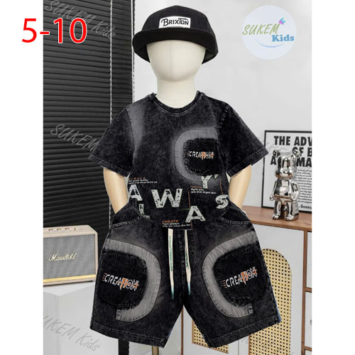 A483639 - Bộ hip hop wash đá theo quảng châu bé trai áo may ngắn tay đắp túi hộp in cham loang chữ q