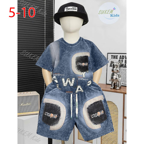 A483643 - Bộ hip hop wash đá theo quảng châu bé trai áo may ngắn tay đắp túi hộp in cham loang chữ q