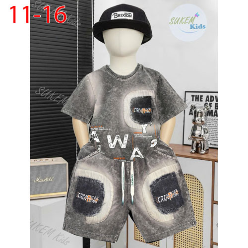 A483645 - Bộ hip hop wash đá theo quảng châu bé trai áo may ngắn tay đắp túi hộp in cham loang chữ q