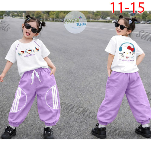 A494194 - Bộ jogger áo may ngắn tay may rút dây 2 bên in kitty quần jogger bo cắt phối lé chạy dây v