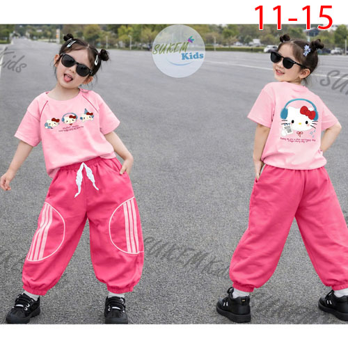 A494195 - Bộ jogger áo may ngắn tay may rút dây 2 bên in kitty quần jogger bo cắt phối lé chạy dây v