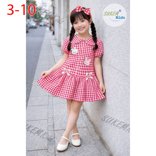 A494428 - Đầm may cổ lá sen đính 2 nơ kèm phụ kiện cài tóc đính thỏ vải kate thô coton_Size 3-10