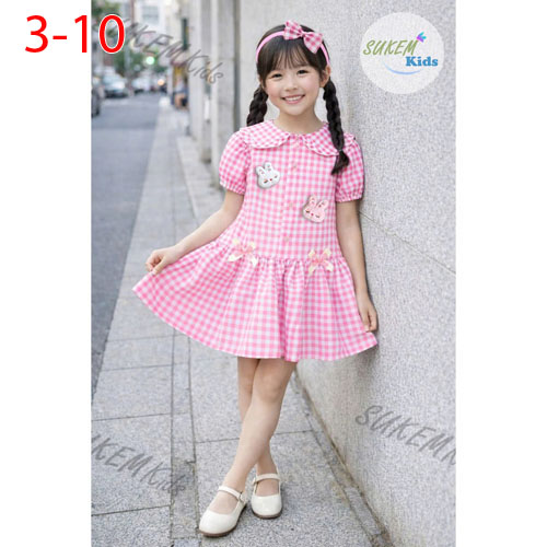 A494431 - Đầm may cổ lá sen đính 2 nơ kèm phụ kiện cài tóc đính thỏ vải kate thô coton_Size 3-10