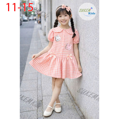 A494433 - Đầm may cổ lá sen đính 2 nơ kèm phụ kiện cài tóc đính thỏ vải kate thô coton_Size 11-15