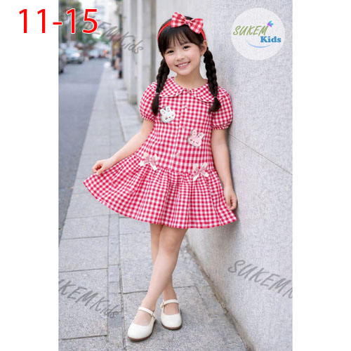 A494435 - Đầm may cổ lá sen đính 2 nơ kèm phụ kiện cài tóc đính thỏ vải kate thô coton_Size 11-15