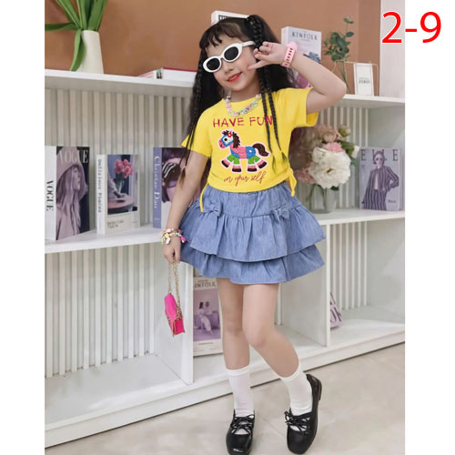 A496251 - Set bé gái áo thun cotton in con ngựa chân váy jean 2 tầng kèm chip trong_Size 2-9