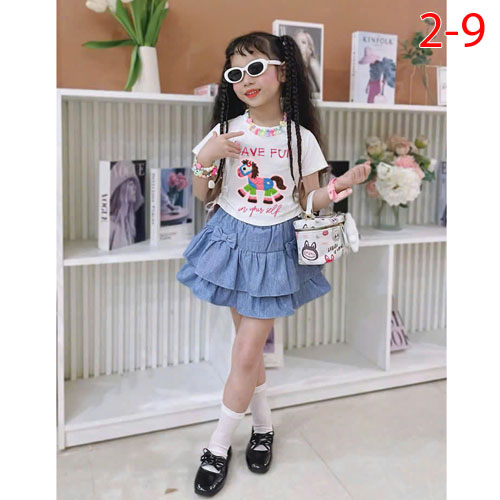 A496252 - Set bé gái áo thun cotton in con ngựa chân váy jean 2 tầng kèm chip trong_Size 2-9