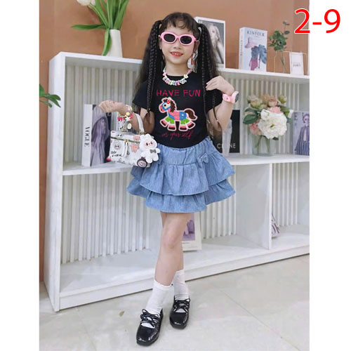 A496253 - Set bé gái áo thun cotton in con ngựa chân váy jean 2 tầng kèm chip trong_Size 2-9