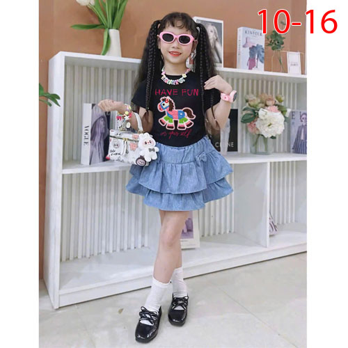 A496254 - Set bé gái áo thun cotton in con ngựa chân váy jean 2 tầng kèm chip trong_Size 10-16