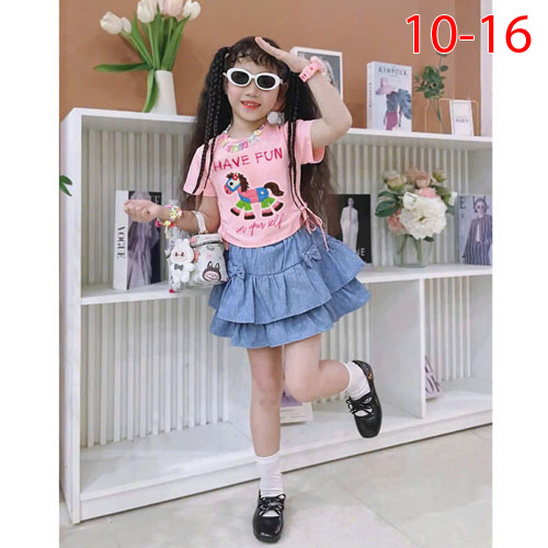 A496257 - Set bé gái áo thun cotton in con ngựa chân váy jean 2 tầng kèm chip trong_Size 10-16