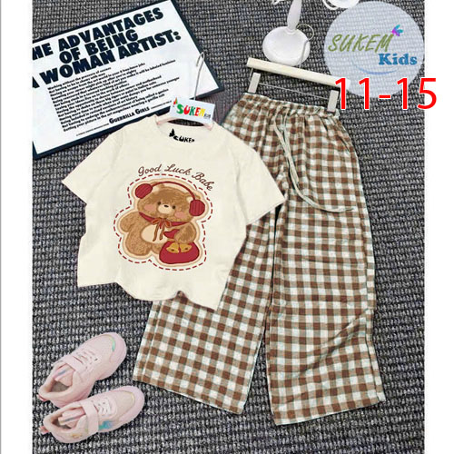 A499336 - Set bé gái áo may ngắn tay hình ép gấu dễ thương với quần dài suông karo coton_Size 11-15