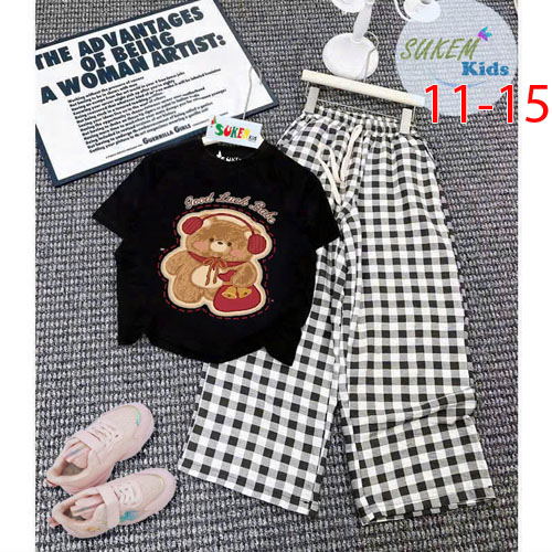 A499337 - Set bé gái áo may ngắn tay hình ép gấu dễ thương với quần dài suông karo coton_Size 11-15