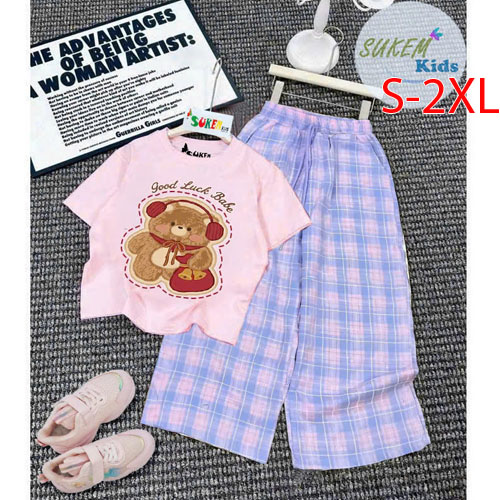 A499344 - Set bé gái áo may ngắn tay hình ép gấu dễ thương với quần dài suông karo coton_Size S-2XL