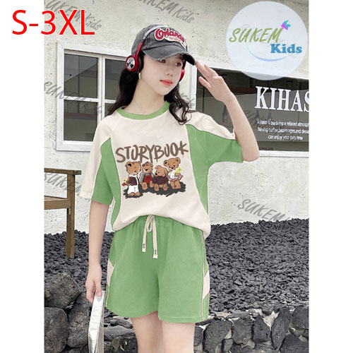 A500355 - Bộ short thể thao cho bé gái thun cotton 4c áo may viền cổ và tay cắt rã thể thao ép gấu q