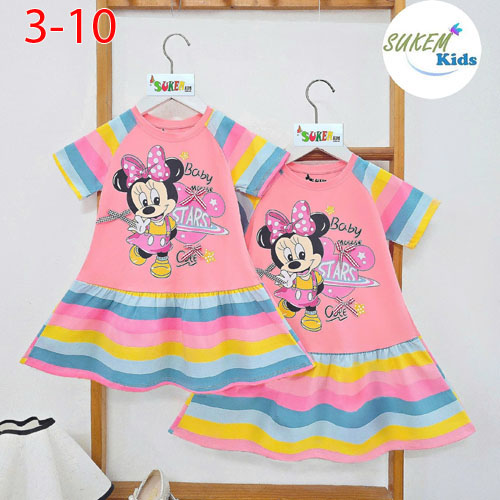 A500667 - Đầm thun tay ráp lăng ép hình MICKEY đính nơ may xếp ly đuôi cá cực xinh vải thun sọc cầu
