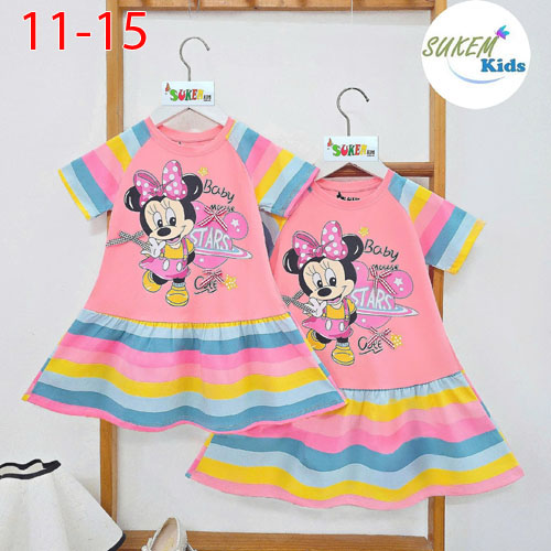 A500668 - Đầm thun tay ráp lăng ép hình MICKEY đính nơ may xếp ly đuôi cá cực xinh vải thun sọc cầu
