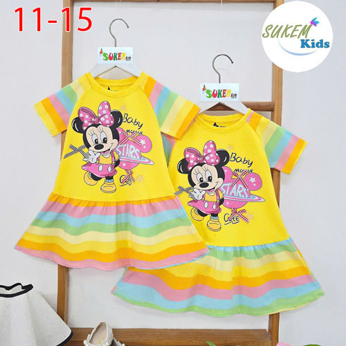 A500671 - Đầm thun tay ráp lăng ép hình MICKEY đính nơ may xếp ly đuôi cá cực xinh vải thun sọc cầu