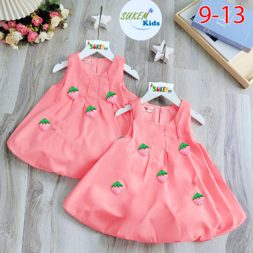 A501529 - Đầm may nhún ly tùng bí 2 lớp đính trái dâu và thỏ vịt bông siêu cute vải thun cotton_Size