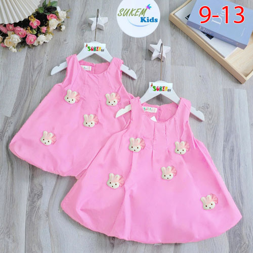 A501531 - Đầm may nhún ly tùng bí 2 lớp đính trái dâu và thỏ vịt bông siêu cute vải thun cotton_Size