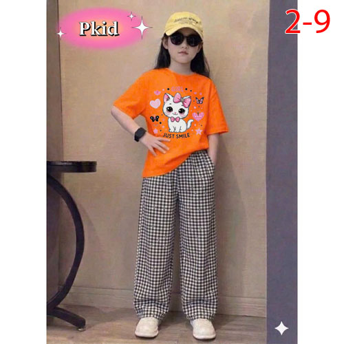 A501631 - Set bé gái áo thun cotton in Kitty mèo quần chất cotton hàn caro dài_Size 2-9