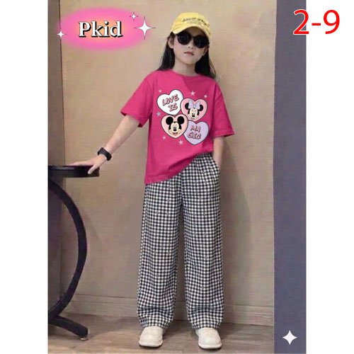 A501641 - Set bé gái áo thun cotton in Kitty mèo quần chất cotton hàn caro dài_Size 2-9