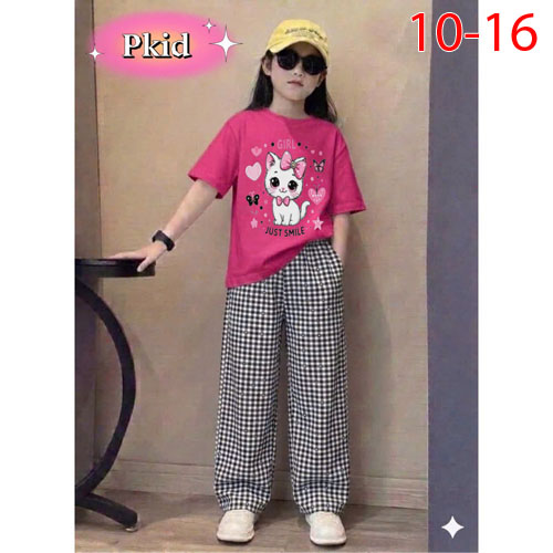A501648 - Set bé gái áo thun cotton in Kitty mèo quần chất cotton hàn caro dài_Size 10-16