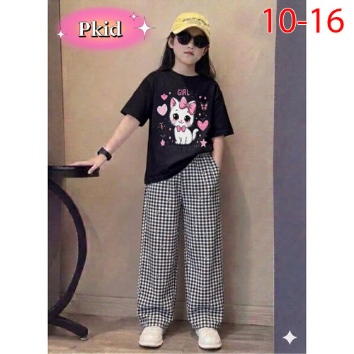 A501649 - Set bé gái áo thun cotton in Kitty mèo quần chất cotton hàn caro dài_Size 10-16