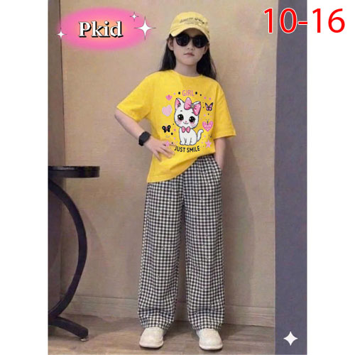 A501650 - Set bé gái áo thun cotton in Kitty mèo quần chất cotton hàn caro dài_Size 10-16