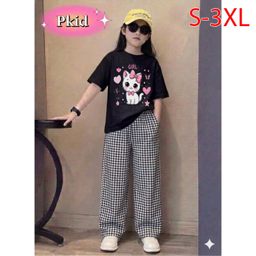 A501661 - Set bé gái áo thun cotton in Kitty mèo quần chất cotton hàn caro dài_Size S-3XL