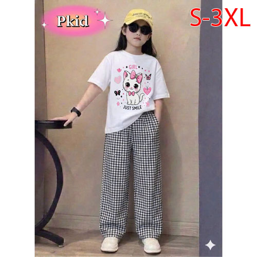 A501663 - Set bé gái áo thun cotton in Kitty mèo quần chất cotton hàn caro dài_Size S-3XL