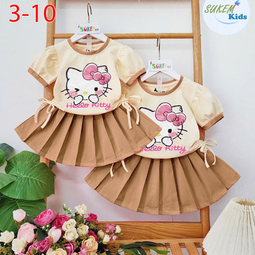 A502823 - Set ép Kitty cute áo rút dây với thiết kế chân váy xếp ly cực xinh_Size 3-10