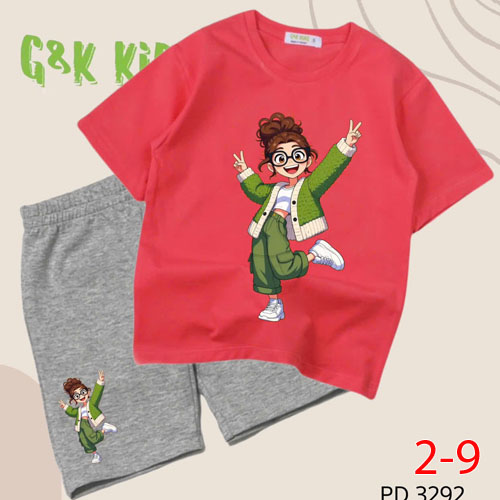 A504057 - Bộ áo phom rộng quần ngố bé gái chất thun coton 4c in cô bé mắt kính tóc xù_Size 2-9