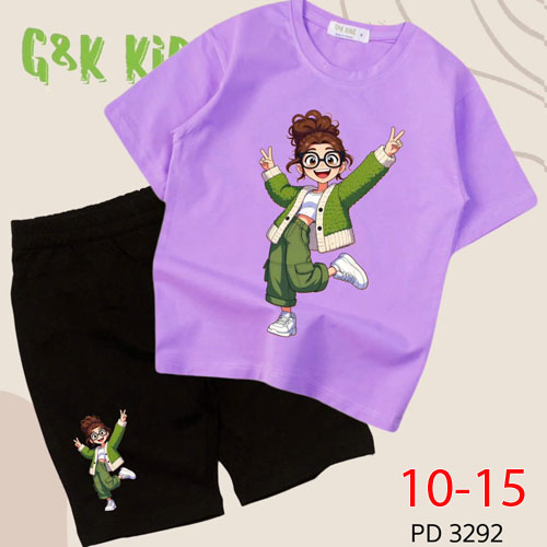 A504077 - Bộ áo phom rộng quần ngố bé gái chất thun coton 4c in cô bé mắt kính tóc xù_Size 10-15