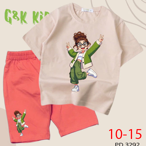 A504092 - Bộ áo phom rộng quần ngố bé gái chất thun coton 4c in cô bé mắt kính tóc xù_Size 10-15