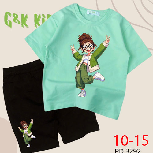 A504093 - Bộ áo phom rộng quần ngố bé gái chất thun coton 4c in cô bé mắt kính tóc xù_Size 10-15