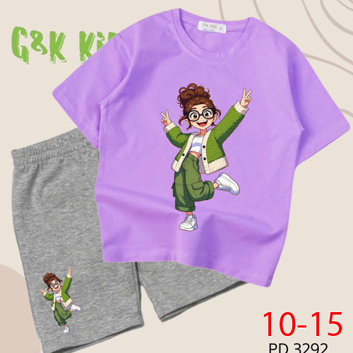 A504095 - Bộ áo phom rộng quần ngố bé gái chất thun coton 4c in cô bé mắt kính tóc xù_Size 10-15