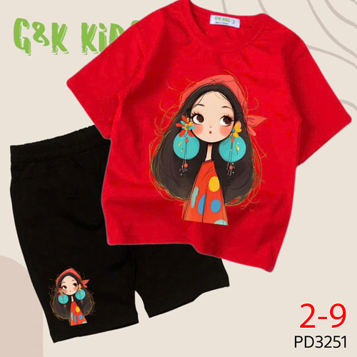 A504751 - Bộ áo phom rộng quần ngố bé gái thun coton 4c in cô bé đội khăn đỏ_Size 2-9