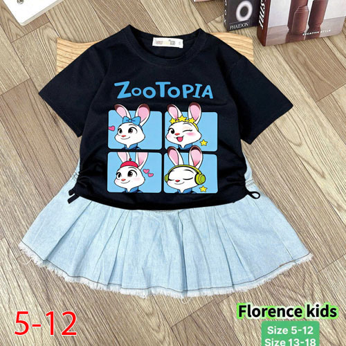 A506330 - Set bé gái áo chất cotton 4c in thỏ Zoo Topia chân váy jean xếp ly_Size 5-12