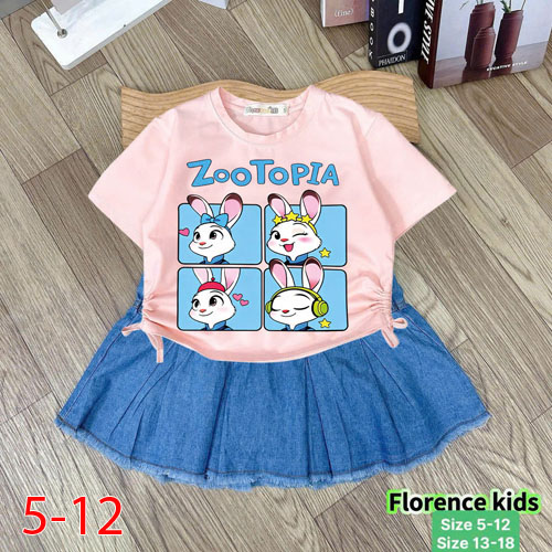 A506334 - Set bé gái áo chất cotton 4c in thỏ Zoo Topia chân váy jean xếp ly_Size 5-12
