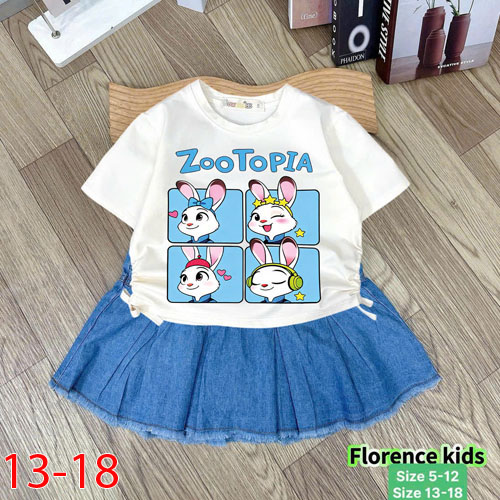 A506338 - Set bé gái áo chất cotton 4c in thỏ Zoo Topia chân váy jean xếp ly_Size 13-18