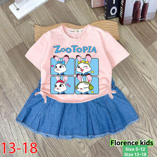 A506339 - Set bé gái áo chất cotton 4c in thỏ Zoo Topia chân váy jean xếp ly_Size 13-18